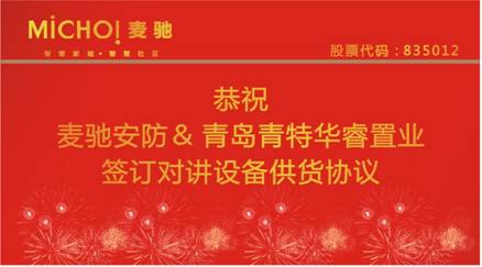 2017年8月,青岛办事处传来捷报,麦驰与青岛青特华睿置业有限公司签订对讲设备供货协议。麦驰凭借在可视对讲领域稳定的产品性能、可靠的产品质量以及完善的售后服务成为青岛青特华睿置业有限公司青特小镇A项目、青特赫山二期项目的可视对讲设备产品的合作供应商。